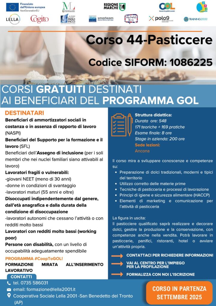 La Cooperativa Lella 2001, ente accreditato per la formazione, propone un corso completamente gratuito per entrare nel mondo della pasticceria artigianale e professionale. Un percorso completo, teorico e pratico, per chi sogna di trasformare la passione per i dolci in una professione.